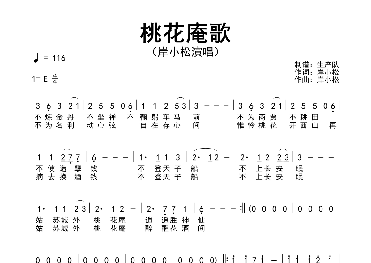 曲谱介绍: 岸小松《桃花庵歌》,生产队编配出品,共有1张高清图谱,免翻页排版设计。