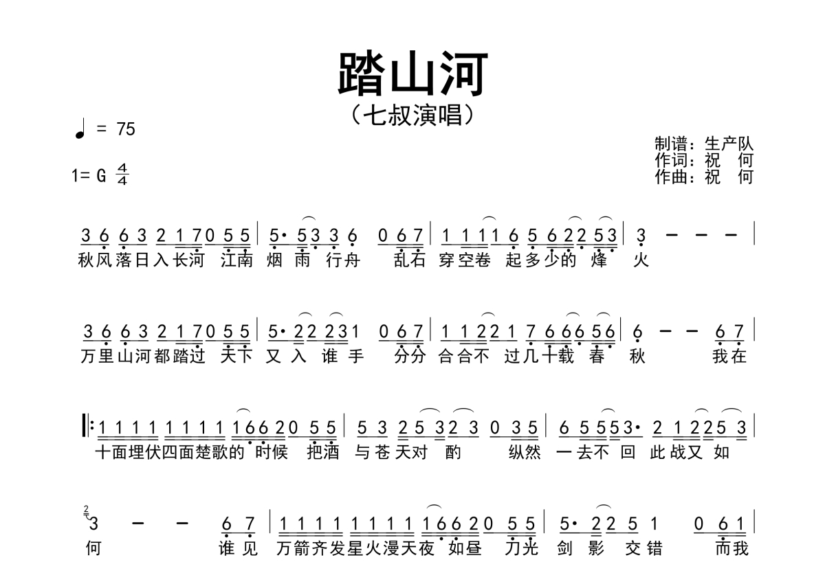 曲谱介绍: 七叔《踏山河》,生产队编配出品,共有1张高清图谱,免翻页排版设计。