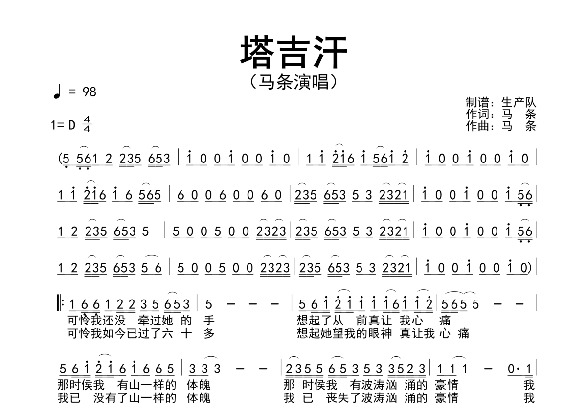 曲谱介绍: 马条《塔吉汗》,生产队编配出品,共有1张高清图谱,免翻页排版设计。
