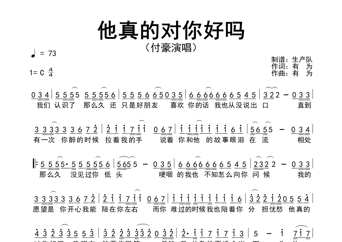• 他真的对你好吗简谱 - 付豪第1张