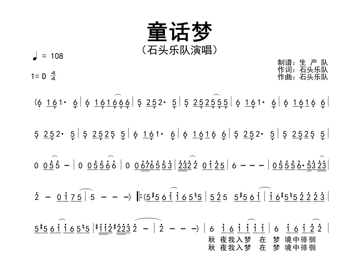 曲谱介绍: 石头乐队《童话梦》,生产队编配出品,共有2张高清图谱,免翻页排版设计。