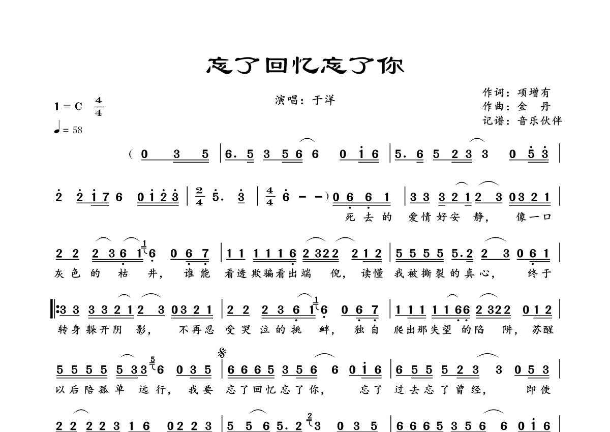 曲谱介绍: 于洋《忘了回忆忘了你》,音乐伙伴编配出品,共有1张高清图谱,免翻页排版设计。