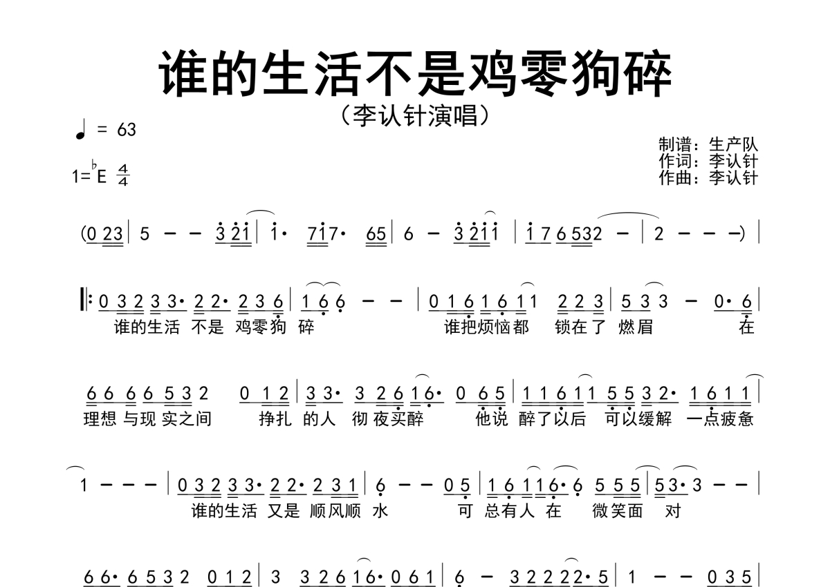 曲谱介绍: 李认针《谁的生活不是鸡零狗碎》简谱,生产队编配出品,共有1张高清图谱,免翻页排版设计。