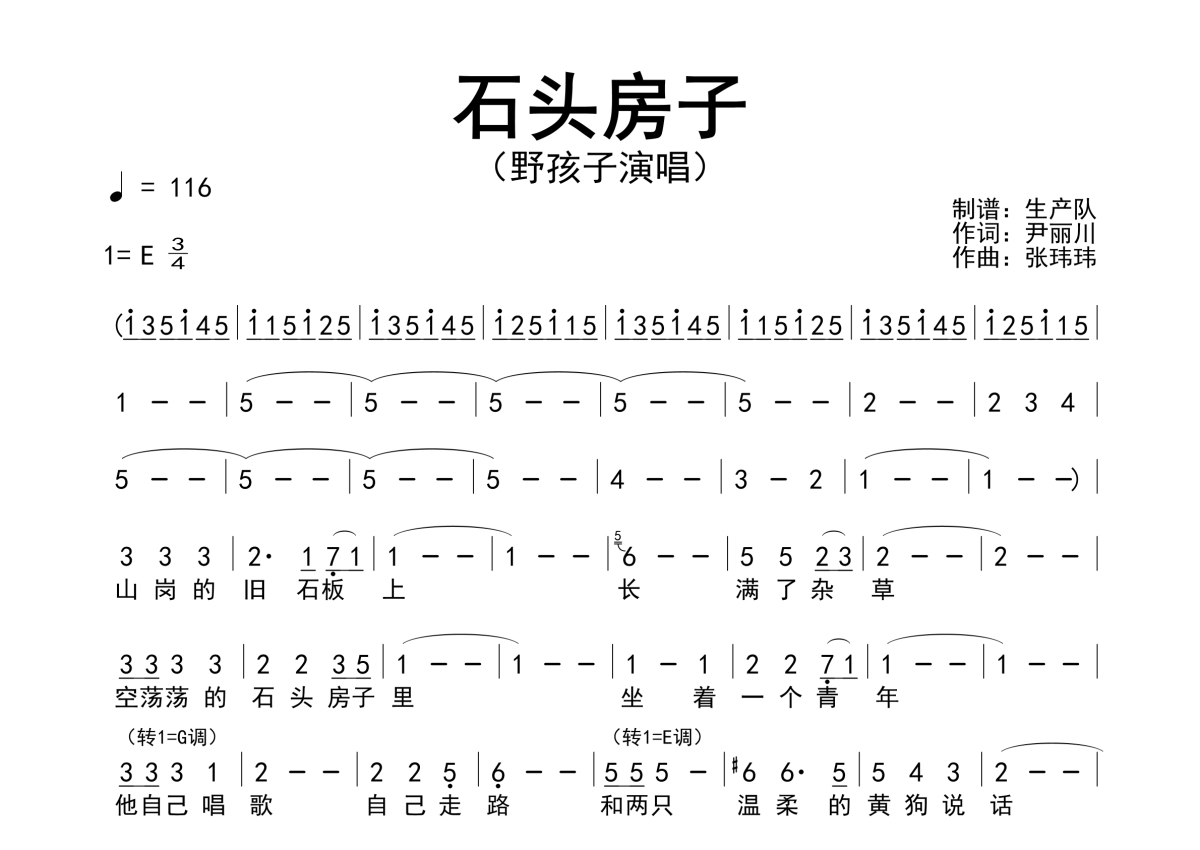 曲谱介绍: 野孩子《石头房子》简谱,生产队编配出品,共有1张高清图谱,免翻页排版设计。