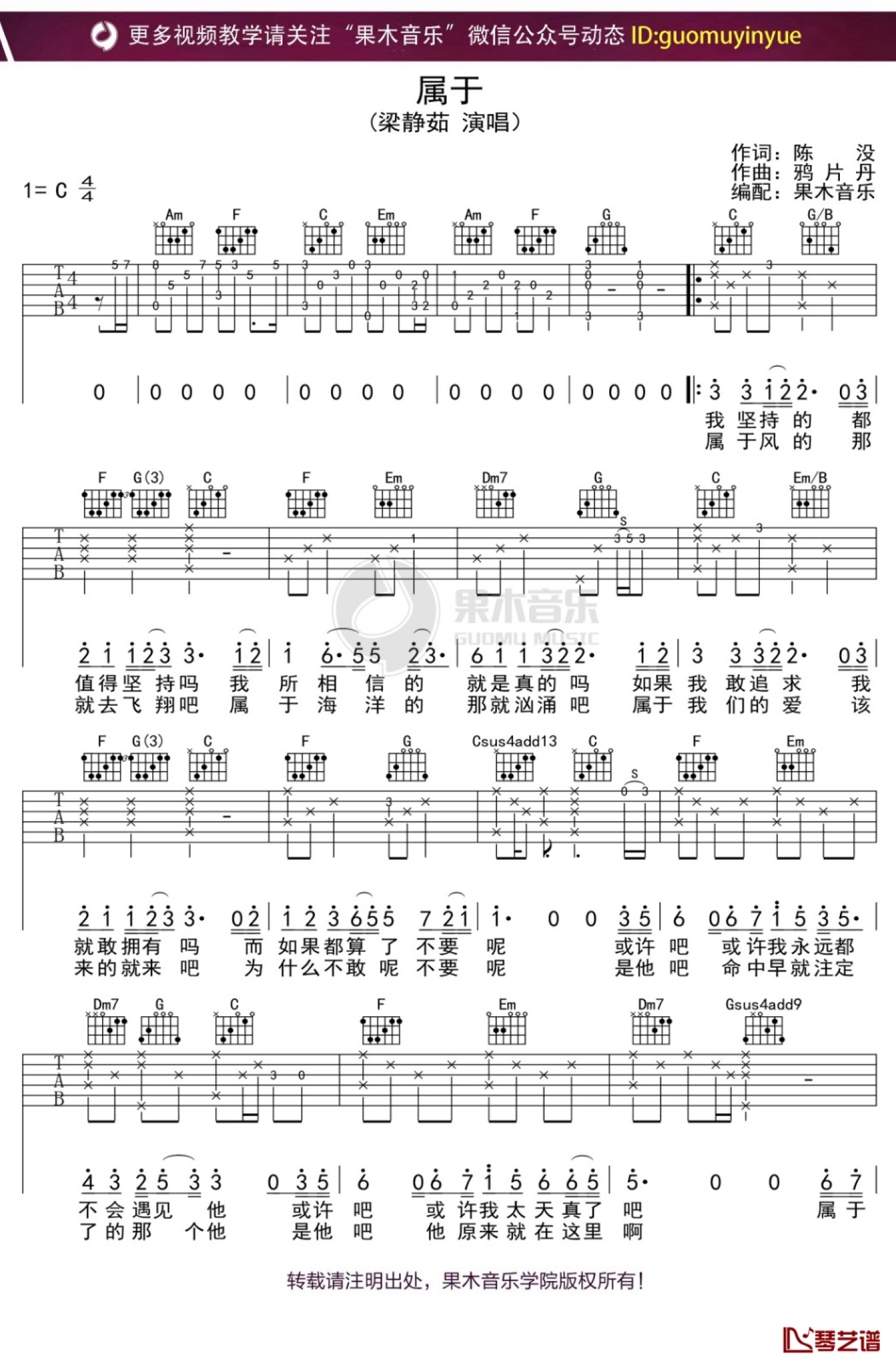 曲谱介绍: 梁静茹《属于》吉他谱_C调吉他弹唱谱