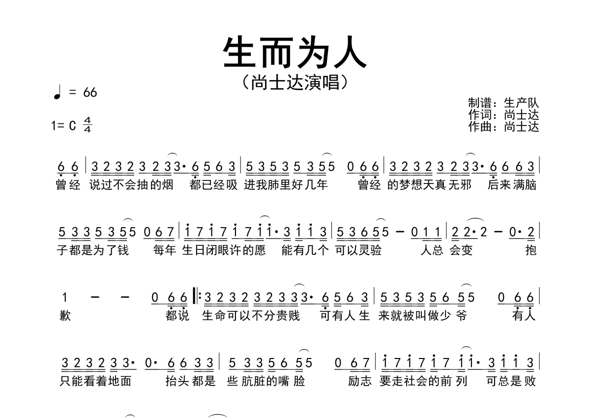 曲谱介绍: 尚士达《生而为人》简谱,生产队编配出品,共有1张高清图谱,免翻页排版设计。