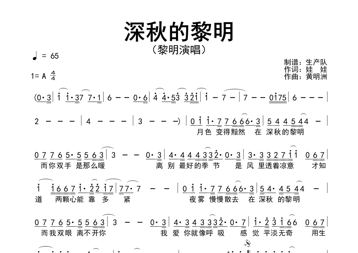 曲谱介绍: 黎明《深秋的黎明》简谱,生产队编配出品,共有1张高清图谱,免翻页排版设计。