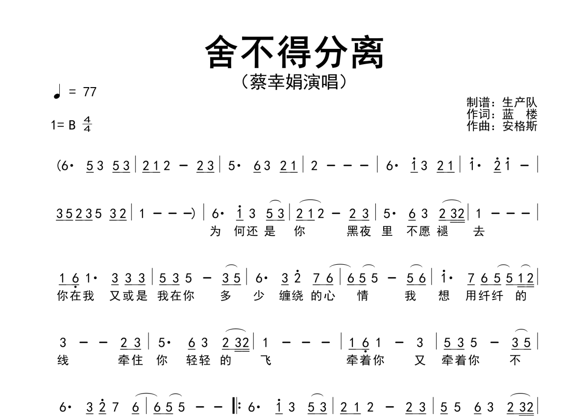 曲谱介绍: 蔡幸娟《舍不得分离》简谱,生产队编配出品,共有1张高清图谱,免翻页排版设计。