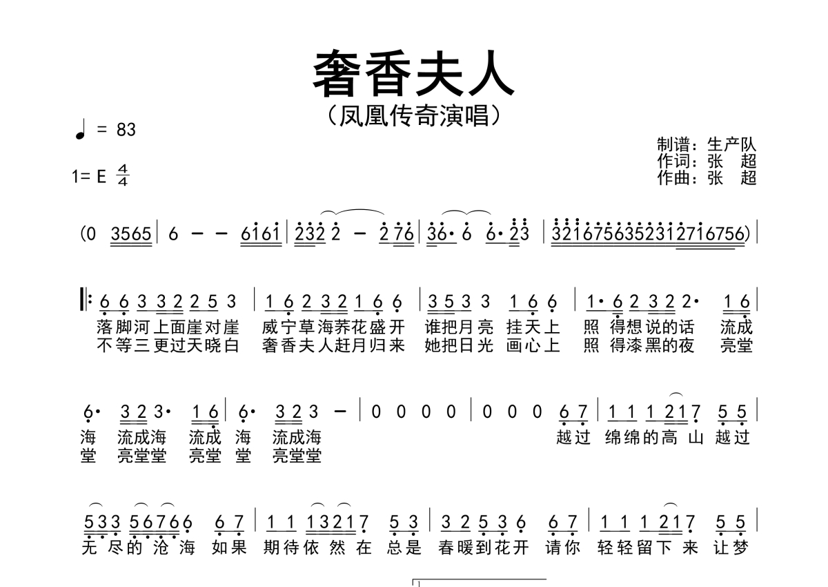 曲谱介绍: 凤凰传奇《奢香夫人》简谱,生产队编配出品,共有1张高清图谱,免翻页排版设计。