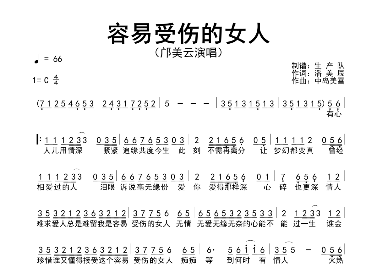 曲谱介绍: 邝美云《容易受伤的女人》简谱,生产队编配出品,共有1张高清图谱,免翻页排版设计。