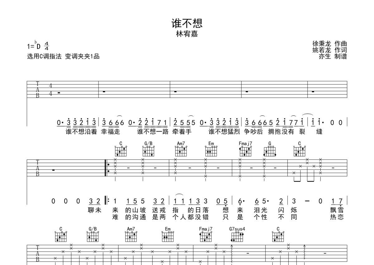曲谱介绍: 林宥嘉《谁不想》吉他弹唱谱,采用C调指法编配,亦生编配出品,共有2张高清图谱,免翻页排版设计。