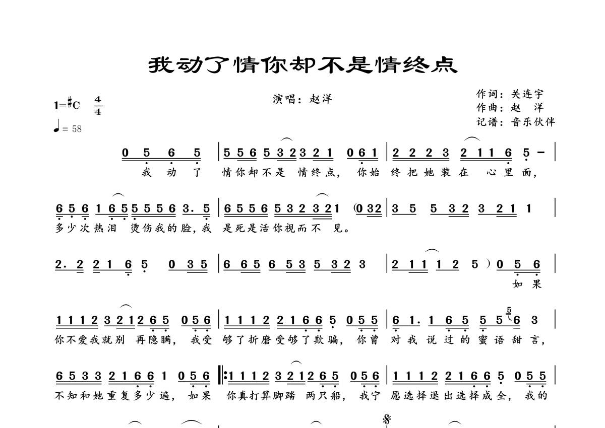曲谱介绍: 赵洋《我动了情你却不是情终点》,音乐伙伴编配出品,共有1张高清图谱,免翻页排版设计。