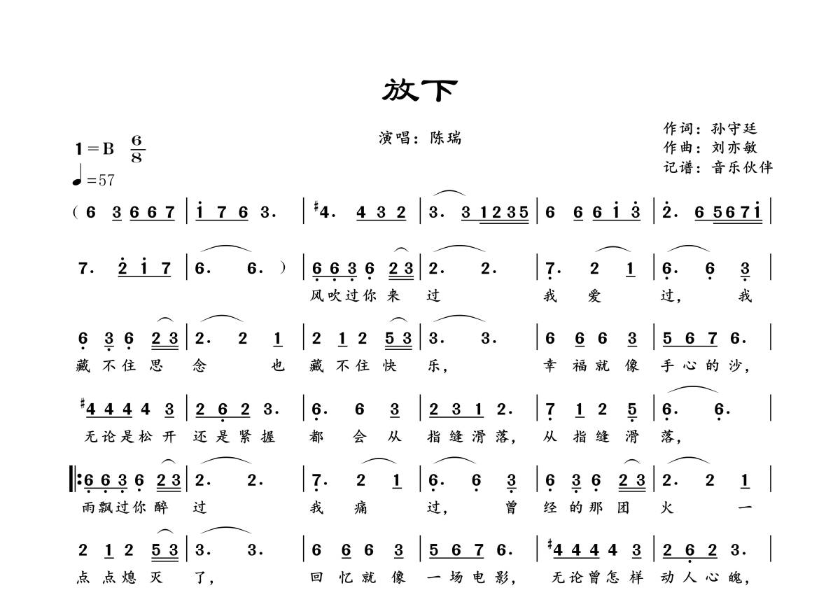 曲谱介绍: 陈瑞《放下》,音乐伙伴编配出品,共有1张高清图谱,免翻页排版设计。