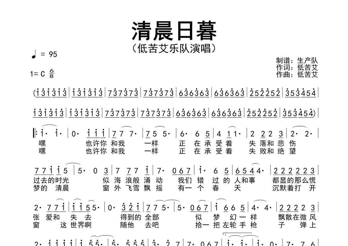 曲谱介绍: 低苦艾乐队《清晨日暮》简谱,生产队编配出品,共有1张高清图谱,免翻页排版设计。