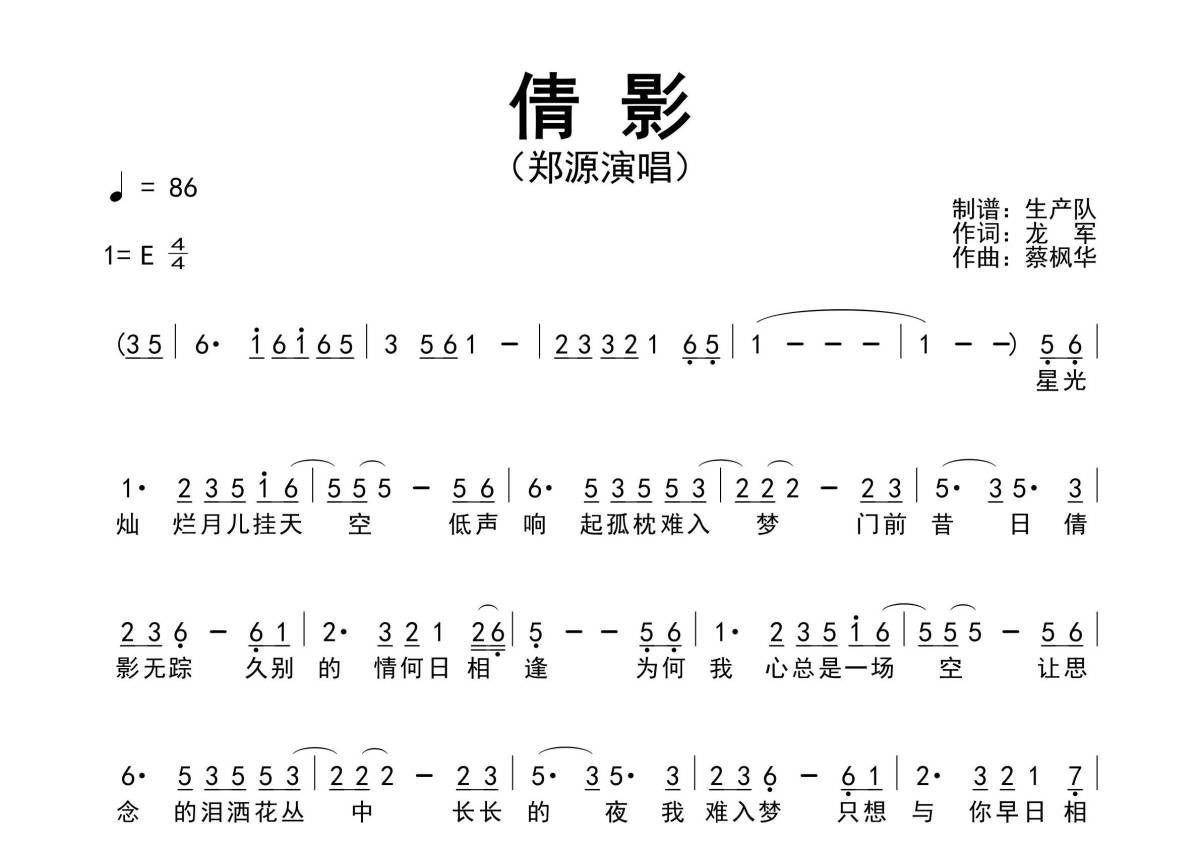 曲谱介绍: 郑源《倩影》简谱,生产队编配出品,共有1张高清图谱,免翻页排版设计。