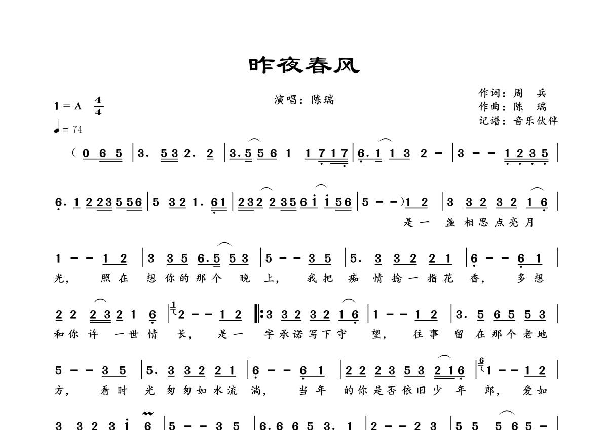 昨夜春风简谱 - 陈瑞