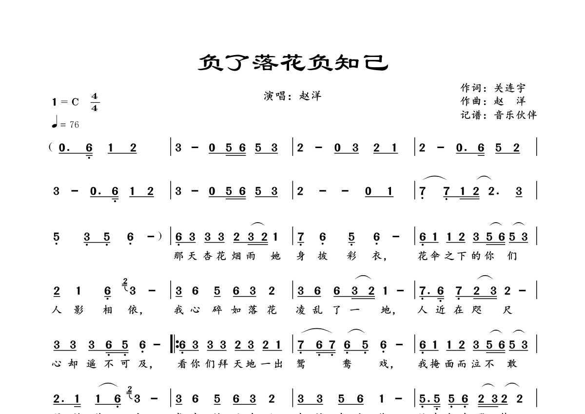 曲谱介绍: 赵洋《负了落花负知己》,音乐伙伴编配出品,共有1张高清图谱,免翻页排版设计。