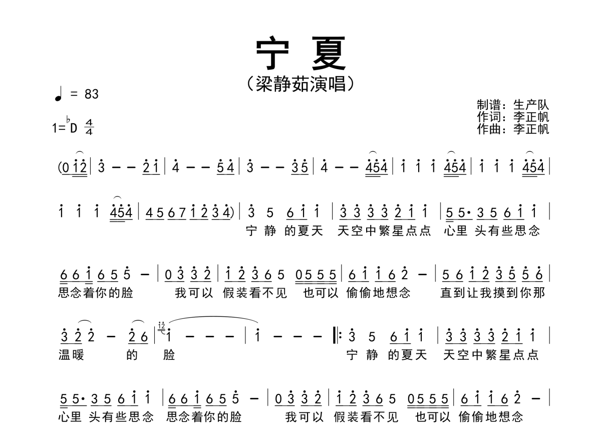 曲谱介绍: 梁静茹《宁夏》,生产队编配出品,共有1张高清图谱,免翻页排版设计。