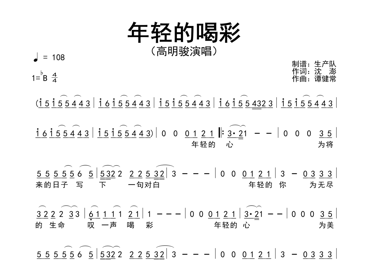 曲谱介绍: 高明骏《年轻的喝彩》,生产队编配出品,共有1张高清图谱,免翻页排版设计。