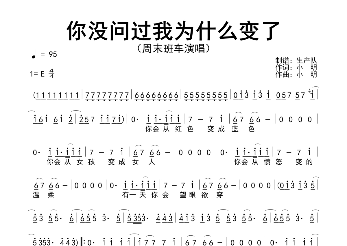 曲谱介绍: 周末班车《你没问过我为什么变了》,生产队编配出品,共有1张高清图谱,免翻页排版设计。
