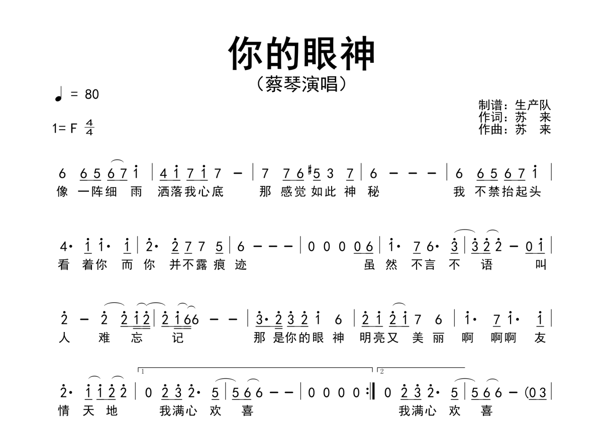 曲谱介绍: 蔡琴《你的眼神》,生产队编配出品,共有1张高清图谱,免翻页排版设计。
