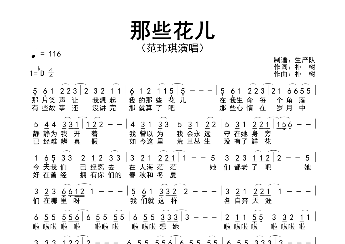 曲谱介绍: 范玮琪《那些花儿》,生产队编配出品,共有1张高清图谱,免翻页排版设计。
