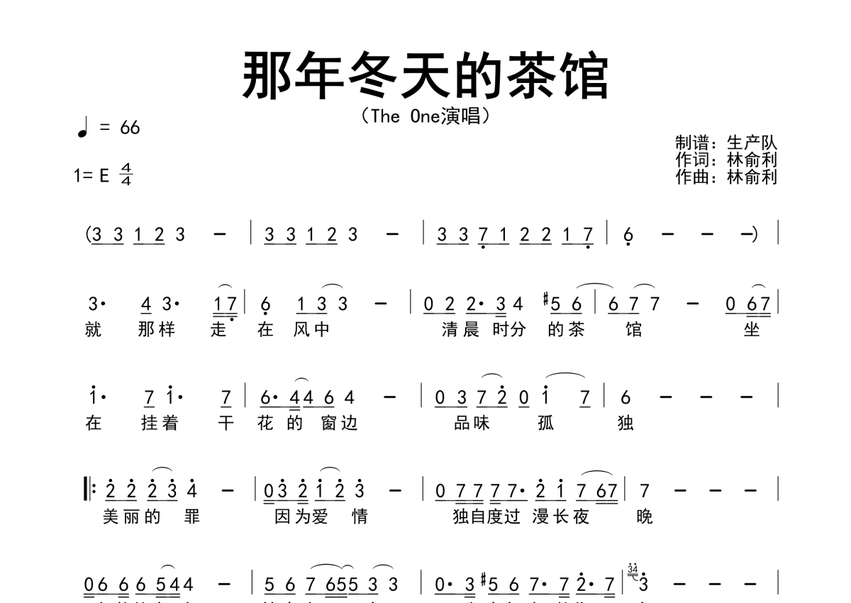 曲谱介绍: TheOne《那年冬天的茶馆》,生产队编配出品,共有1张高清图谱,免翻页排版设计。