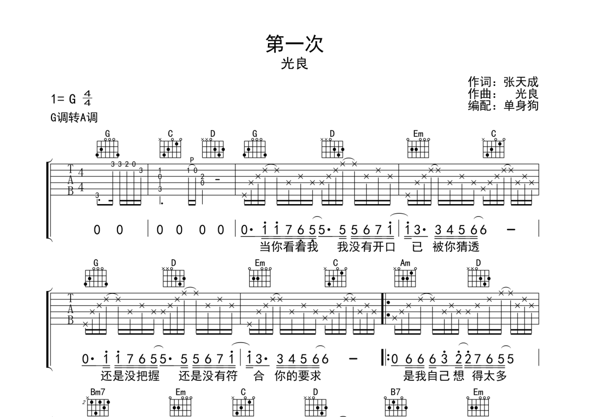 曲谱介绍: 光良《第一次》吉他弹唱谱,采用G调指法编配,单身狗编配出品,共有3张高清图谱。