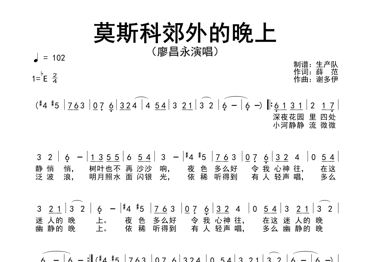 曲谱介绍: 廖昌永《莫斯科郊外的晚上》简谱,生产队编配出品,共有1张高清图谱,免翻页排版设计。