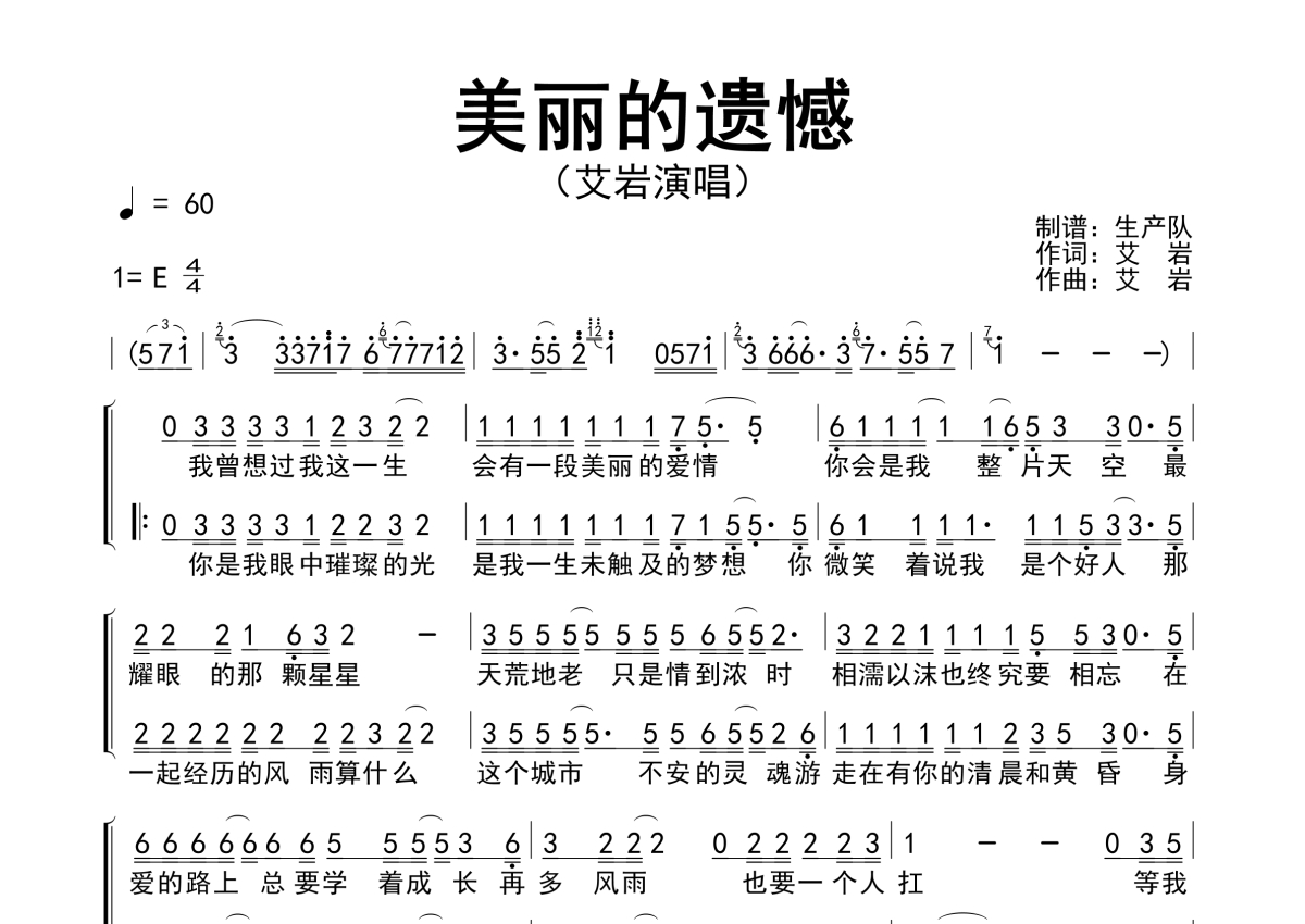 曲谱介绍: 平凡的艾岩《美丽的遗憾》简谱,生产队编配出品,共有1张高清图谱,免翻页排版设计。