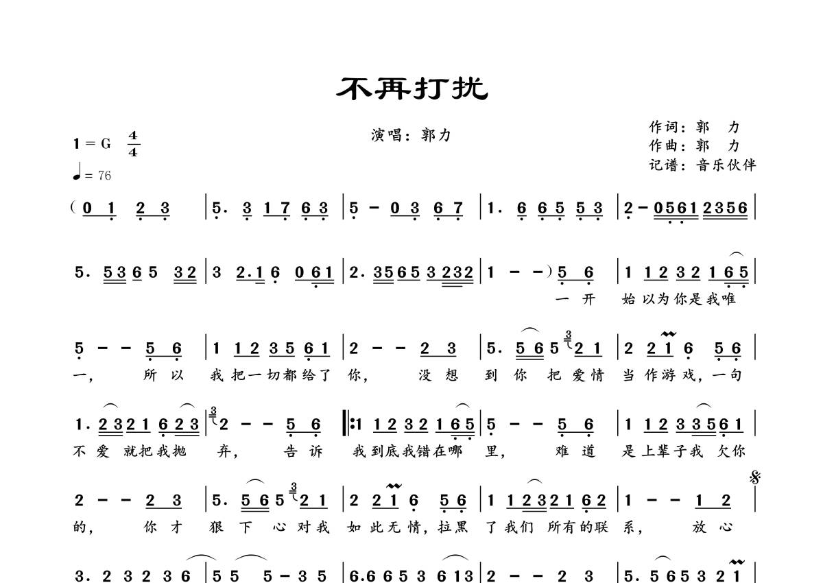 曲谱介绍: 郭力《不再打扰》,音乐伙伴编配出品,共有1张高清图谱,免翻页排版设计。