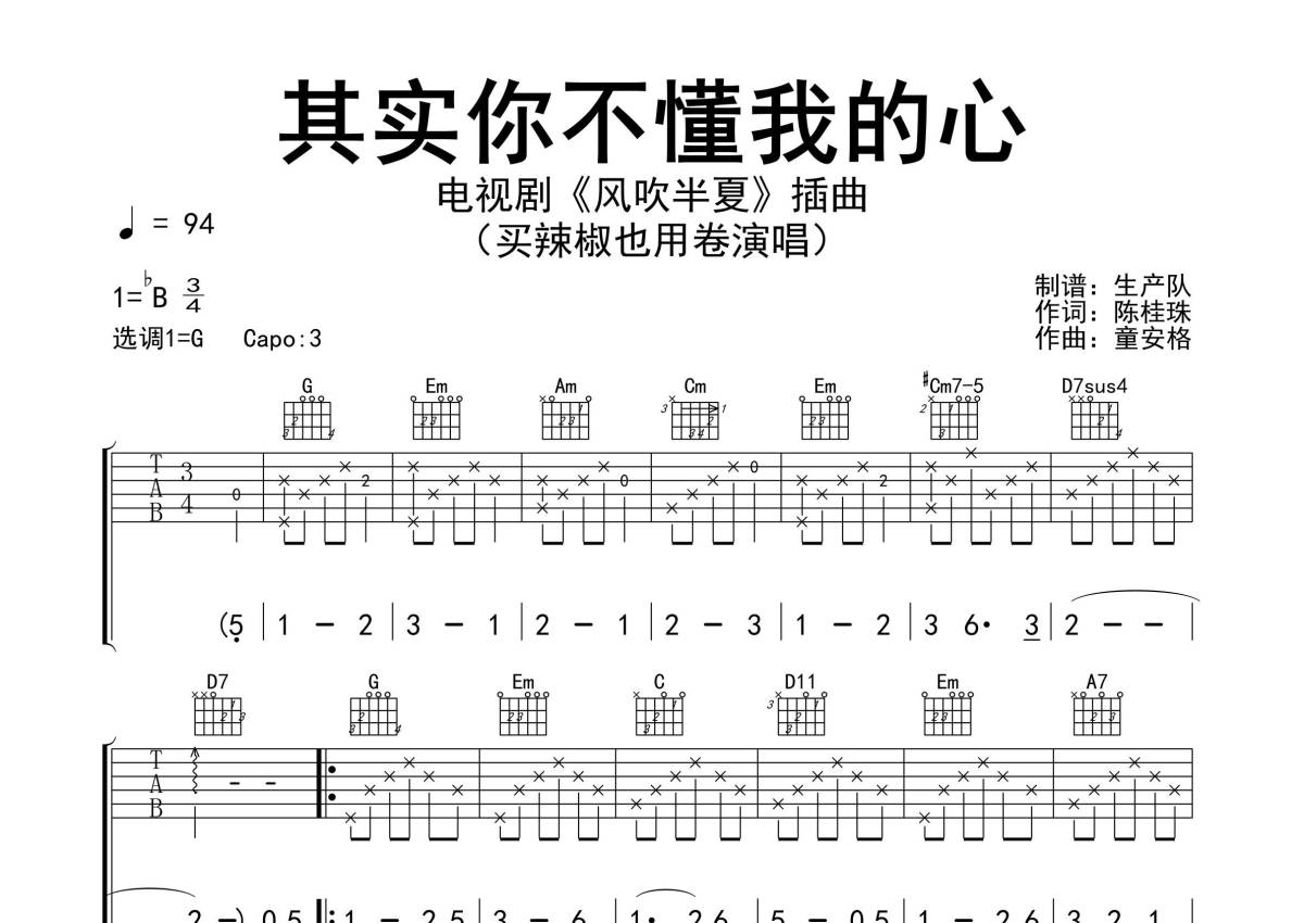 曲谱介绍: 买辣椒也用卷《其实你不懂我的心》吉他弹唱谱,采用G调指法编配精编完美版,生产队编配出品,共有2张高清图谱,免翻页排版设计。