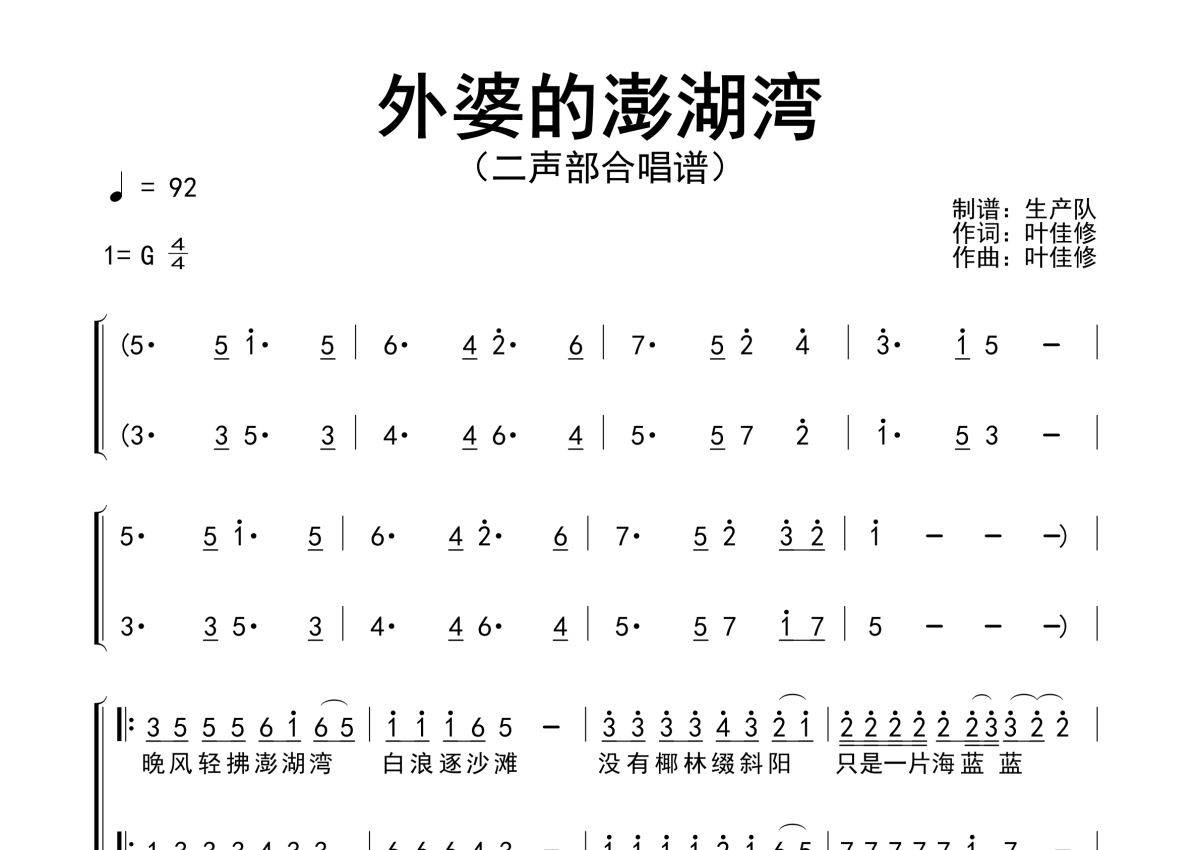 曲谱介绍: 潘安邦《外婆的澎湖湾》二声部合唱谱,生产队编配出品,共有3张高清图谱。