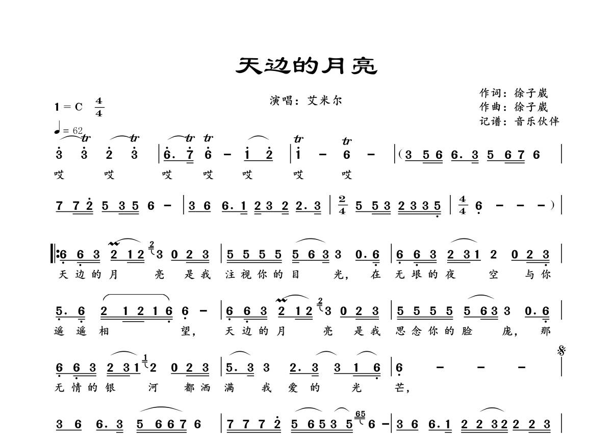 曲谱介绍: 艾米尔《天边的月亮》,音乐伙伴编配出品,共有1张高清图谱,免翻页排版设计。