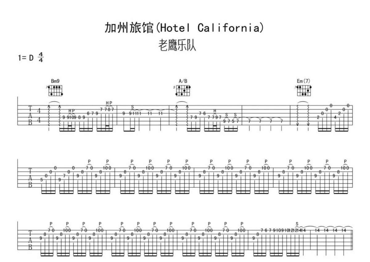 曲谱介绍: Eagles(老鹰乐队)《加州旅馆》吉他弹唱谱,采用D调指法编配,音符喷血者编配出品,共有8张高清图谱。