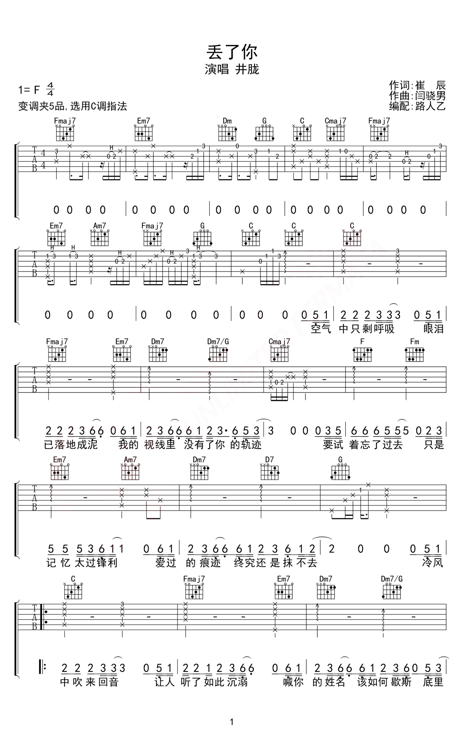 丢了你吉他谱 - 井胧 - C调吉他弹唱谱