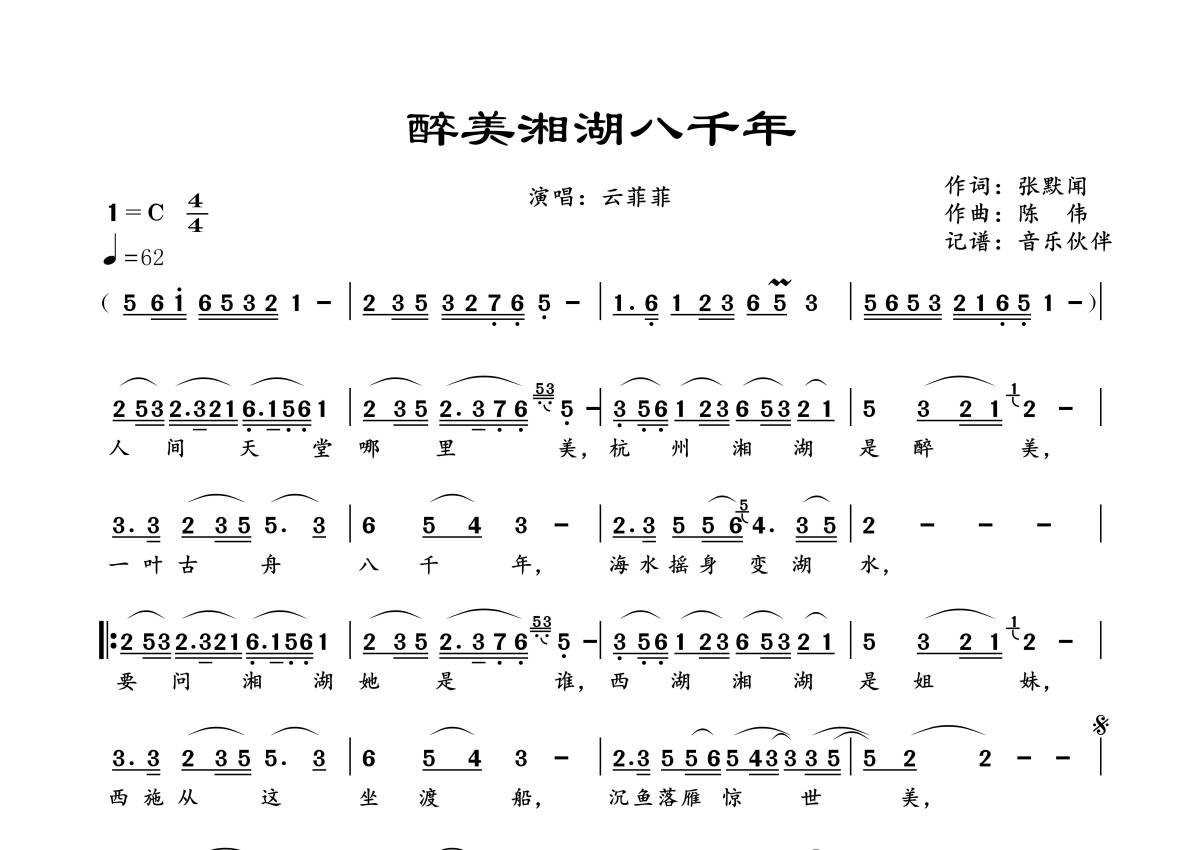 曲谱介绍: 云菲菲《醉美湘湖八千年》,音乐伙伴编配出品,共有1张高清图谱,免翻页排版设计。