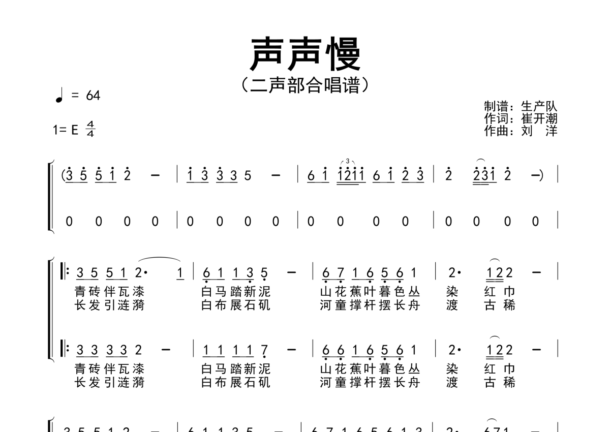 曲谱介绍: 崔开潮《声声慢》二声部合唱谱,生产队编配出品,共有2张高清图谱,免翻页排版设计。