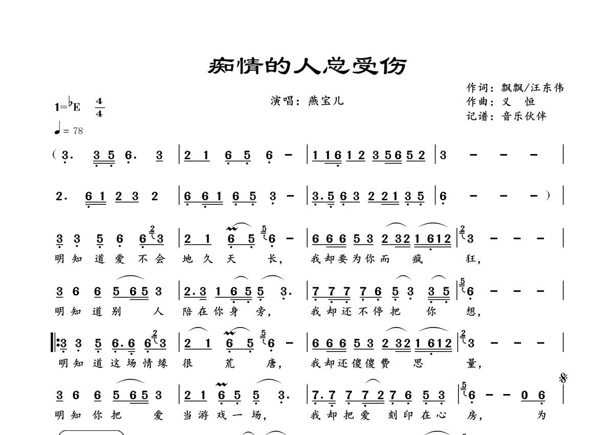 曲谱介绍: 燕宝儿《痴情的人总受伤》,音乐伙伴编配出品,共有1张高清图谱,免翻页排版设计。
