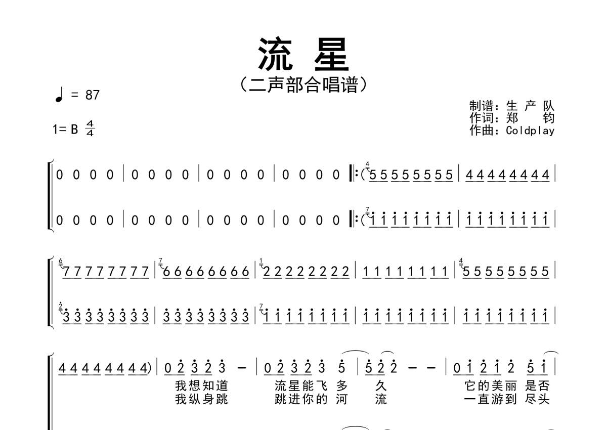 流星简谱 - 合唱谱 - 二声部合唱谱