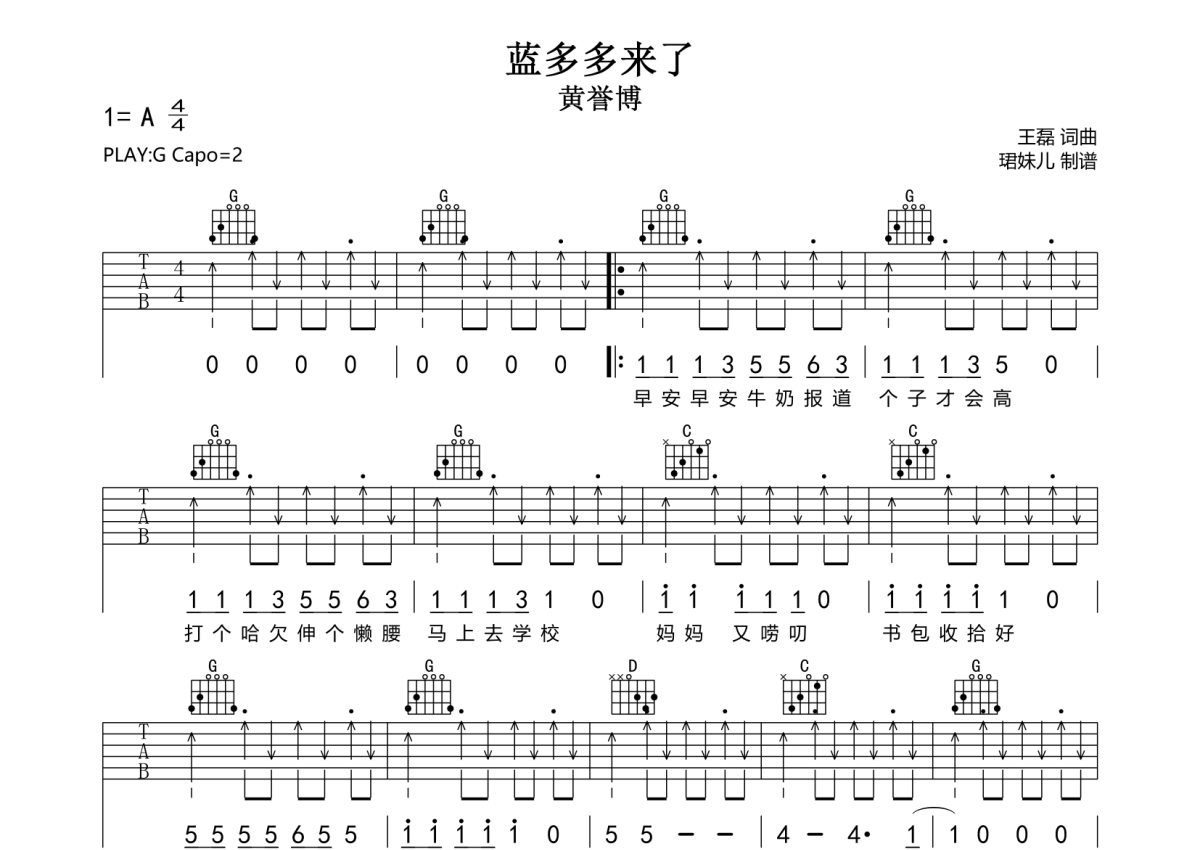 • 蓝多多来了吉他谱 - 黄誉博 - G调吉他弹唱谱第1张