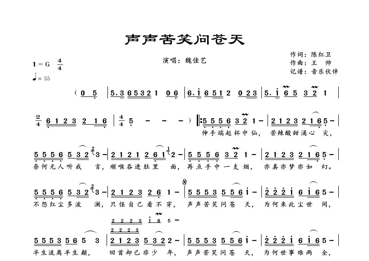 曲谱介绍: 魏佳艺《声声苦笑问苍天》,音乐伙伴编配出品,共有1张高清图谱,免翻页排版设计。