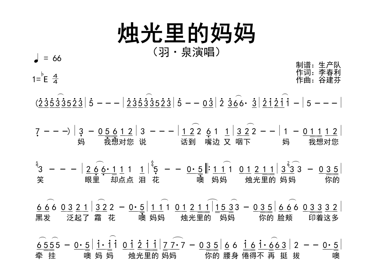 曲谱介绍: 羽泉《烛光里的妈妈》简谱,生产队编配出品,共有1张高清图谱,免翻页排版设计。