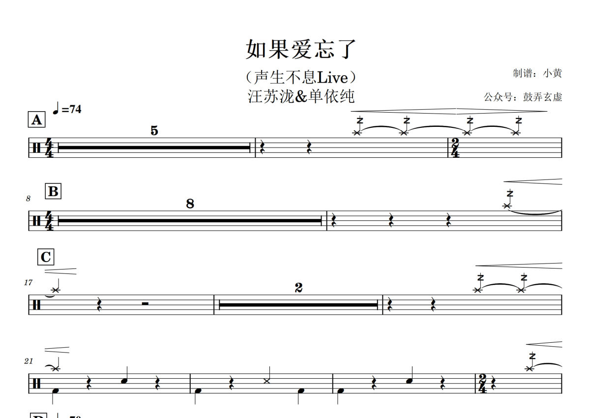 曲谱介绍: 汪苏泷&单依纯《如果爱忘了live》架子鼓谱,小黄编配出品,共有2张高清图谱,免翻页排版设计。