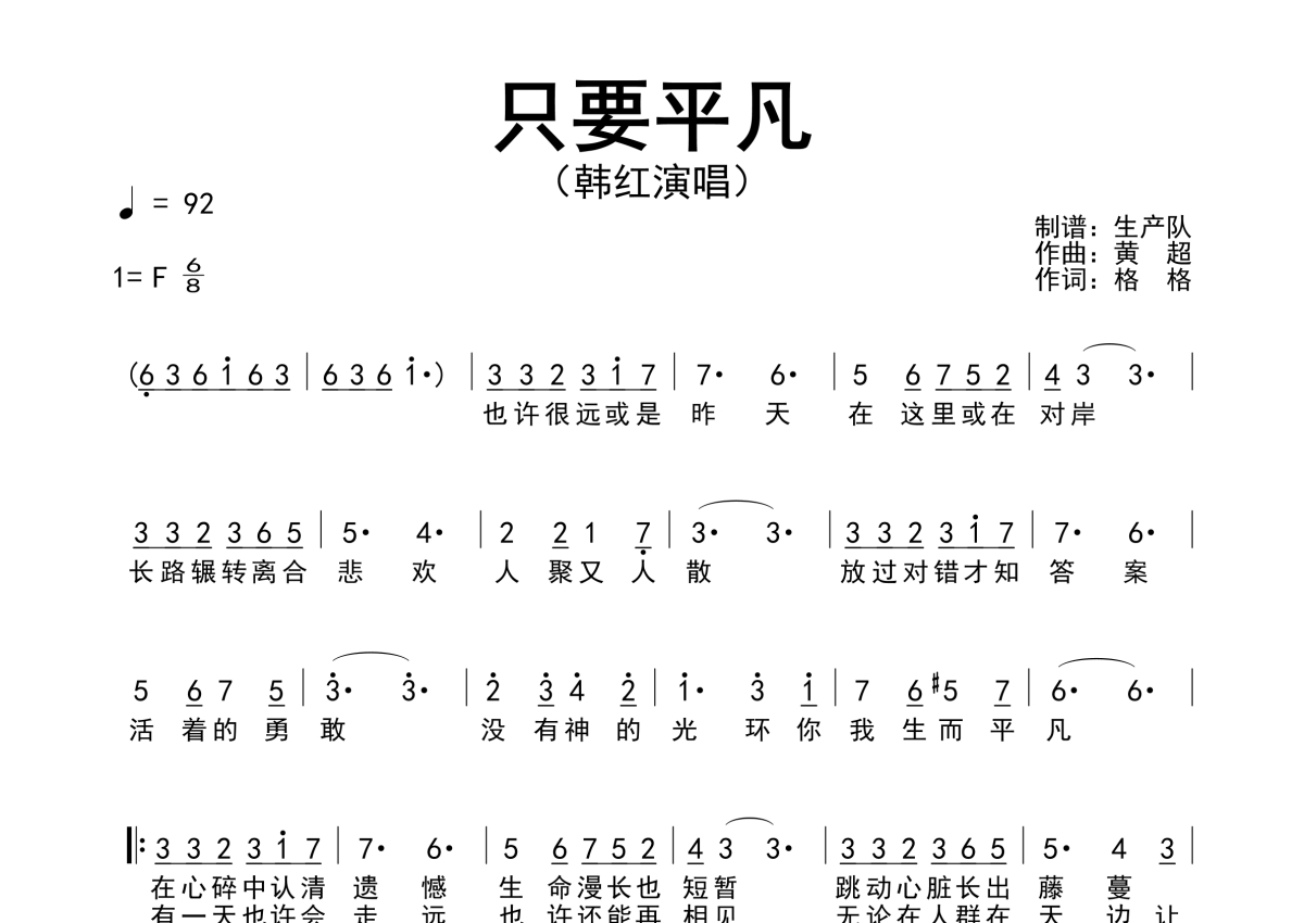 曲谱介绍: 韩红《只要平凡》简谱,生产队编配出品,共有1张高清图谱,免翻页排版设计。