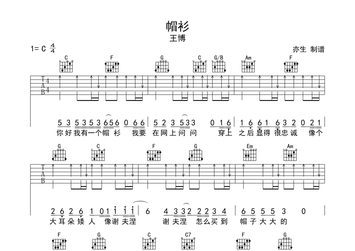 曲谱介绍: 王博《帽衫》吉他弹唱谱,采用C调指法编配,亦生编配出品,共有1张高清图谱,免翻页排版设计。