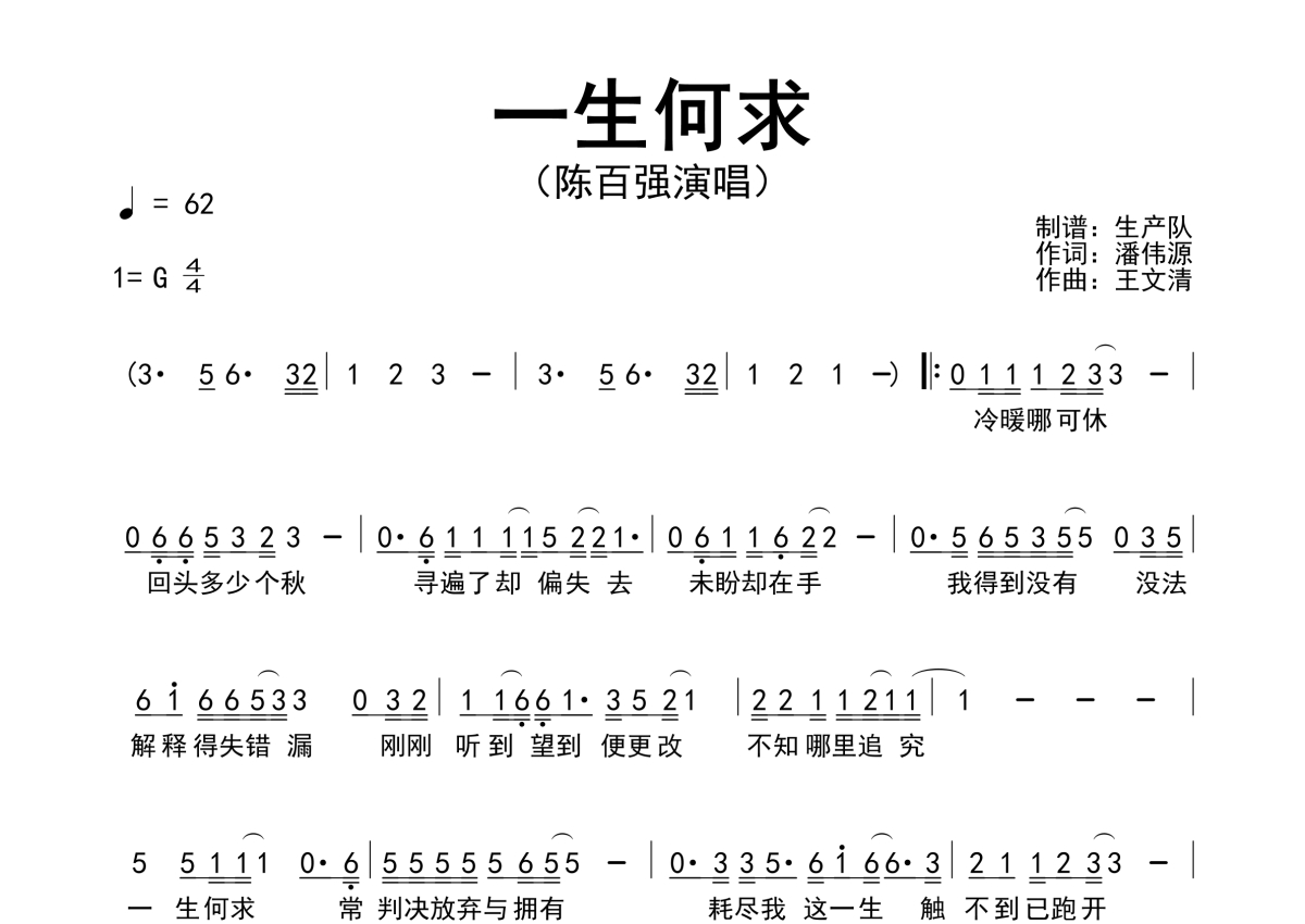 曲谱介绍: 陈百强《一生何求》原版简谱,生产队编配出品,共有1张高清图谱,免翻页排版设计。