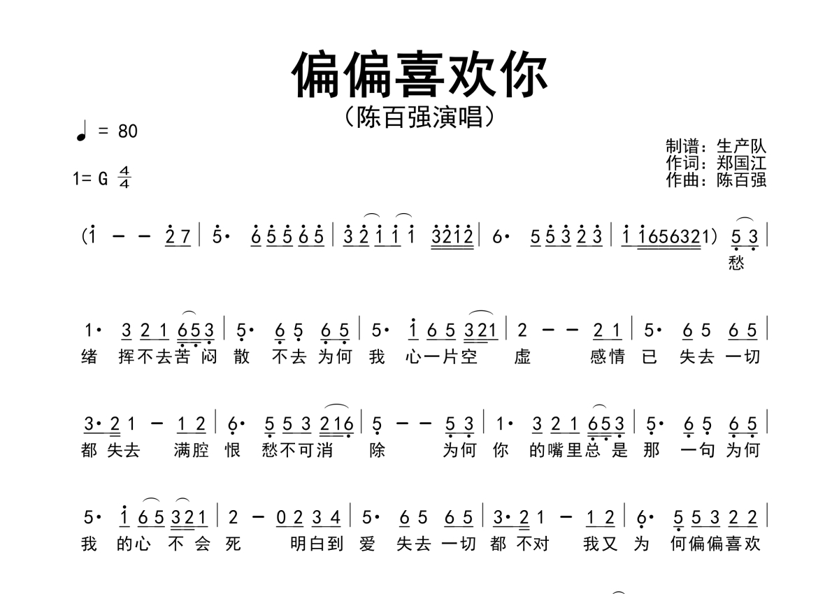 曲谱介绍: 陈百强《偏偏喜欢你》原版简谱,生产队编配出品,共有1张高清图谱,免翻页排版设计。