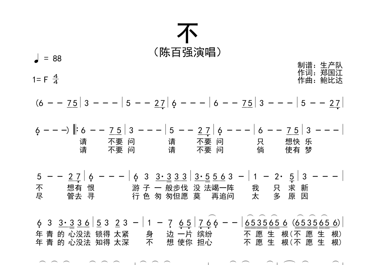 曲谱介绍: 陈百强《不》原版简谱,生产队编配出品,共有1张高清图谱,免翻页排版设计。