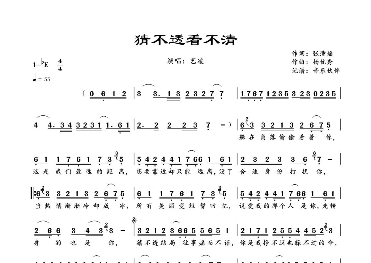 曲谱介绍: 艺凌《猜不透看不清》,音乐伙伴编配出品,共有1张高清图谱,免翻页排版设计。